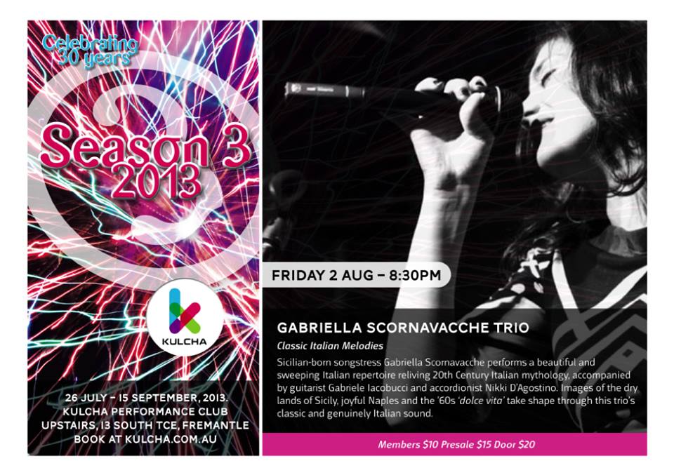 Sicilian born songstress Gabriella Scornavacche performs a beautiful and sweeping Italian repertoire reliving 20th century Italian mythology.