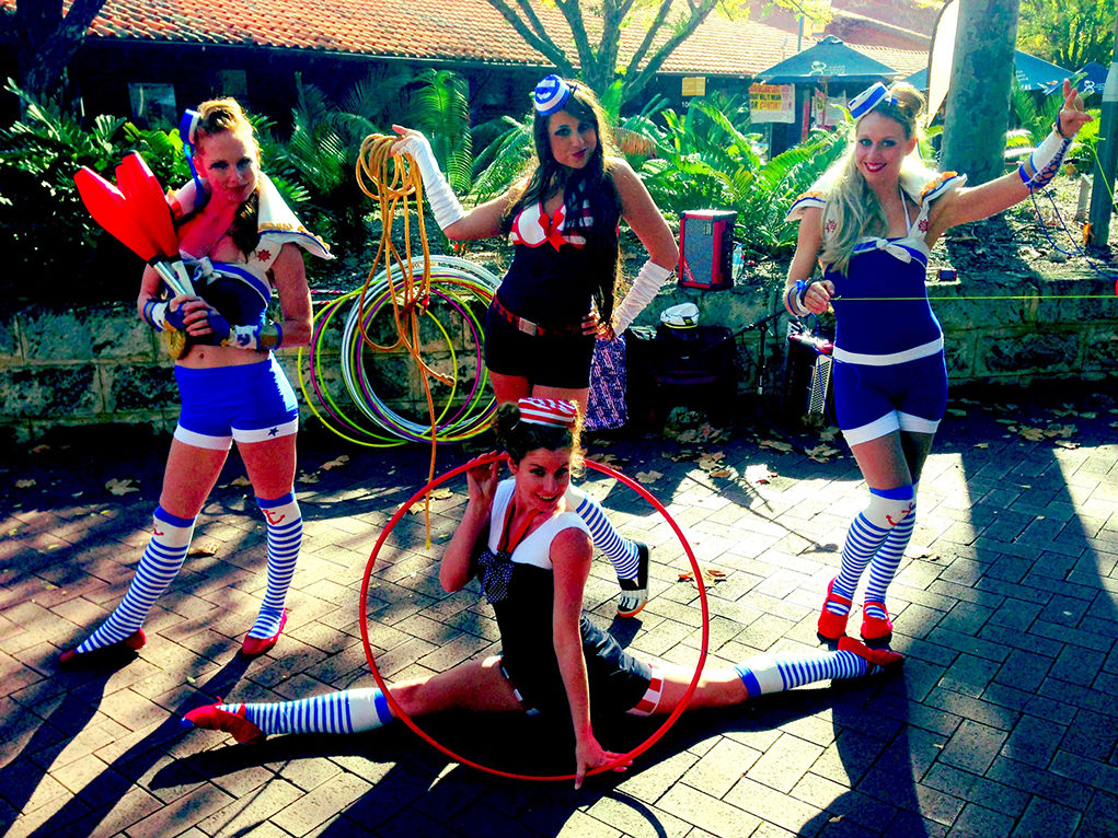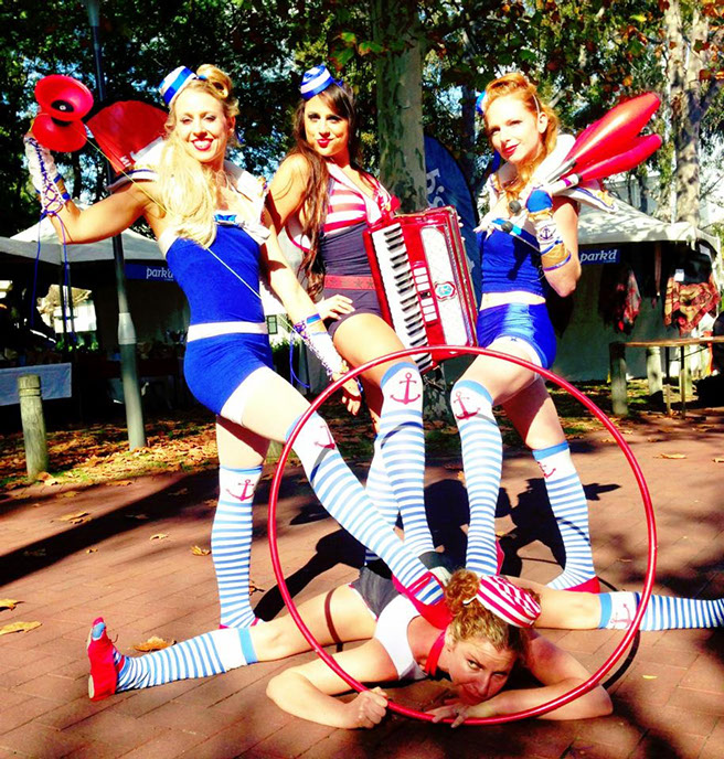 The Sailor Gal Cirque Show are as refreshing as the sea breeze itself! An exciting collection of high class circus performers and musicians, dancing their way through the crowds occasionally pausing to share their sailor gal talents learnt from their world ventures.