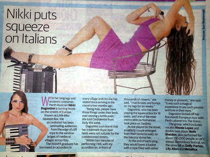 Nikki Dagostino is widely recognised as one of Australia’s most entertaining female Accordionists. Keeping the rare art alive and educating souls with the world sounds of the Piano Accordion.