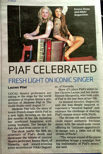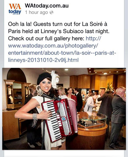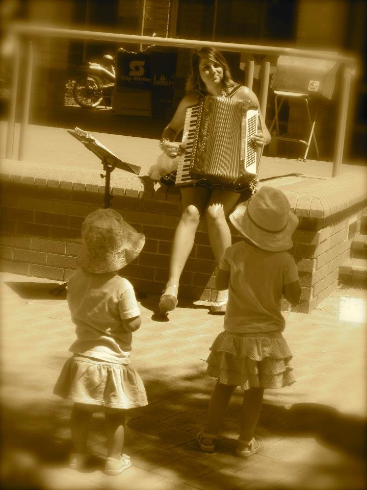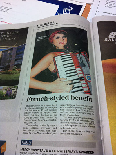 Nikki’s solo accordion act “Little Miss Squeezebox” caters for a wide demographic of audiences, atmospheres and themes. Her repertoire ranges from the Couture to the Contemporary- reminiscing vintage classics, contemporary commercial hits, dance electronica, German Polkas, Italian favoutrites and exquisite renditions of a huge French repertoire ideal for ambient background music which includes Edith Piaf’s well loved repertoire.