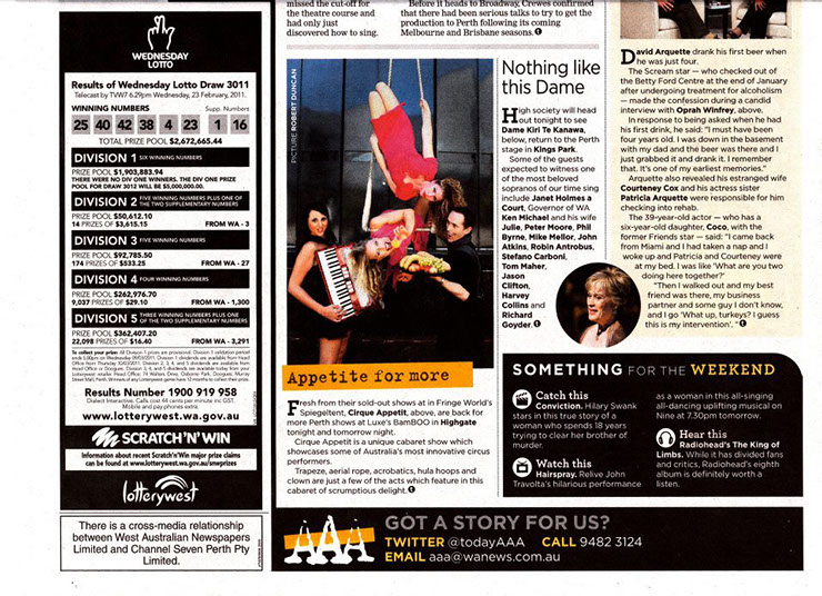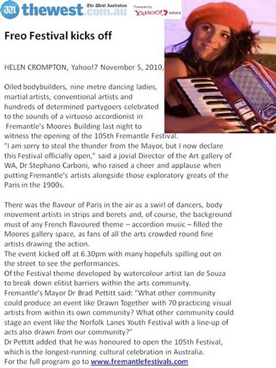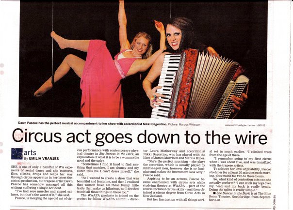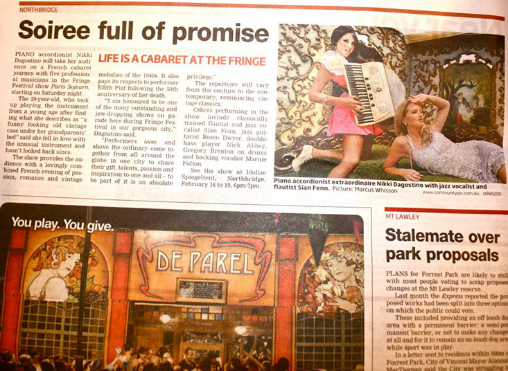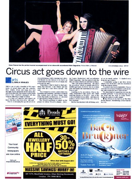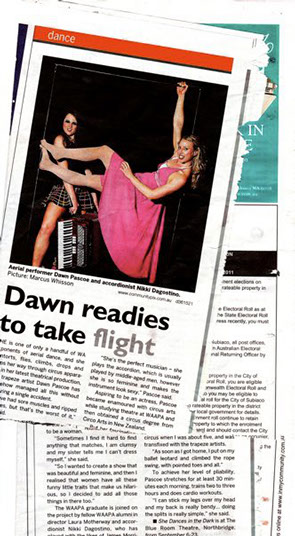 During March (2011), Nikki had the breathtaking experience of performing at The Perth International Arts Festival- Becks Music Box, where she opened and supported America’s sweetheart- Joanna Newsom. During this time and the past 4 years, Nikki was has been heavily involved in the Perth Fringe World Festival- performing inside the De Parel Speigeltent with a variety of shows. Her solo outfit was a hit on the outdoor stage of the inaugural festival for Perth City. The Fringe World Festival has become bigger than ever- with Nikki powering her way through the 25 days of performances amongst over 180,000 people- with a highlight of meeting and conducting a photoshoot with WA premier Mr. Colin Barnett to promote the Arts festival. She was invited to the Awards Ceremony to the pleasing news that her collaboration show ’She Dances in the Dark’ with Dawn Pascoe from Natural Wings was awarded a nomination for Best Circus Theatre Show.