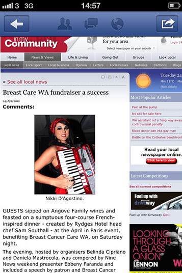 Nikki has also experienced live television exposure appearing annually on Telethon (Channel Seven Perth), local television and monthly airtime on Radio featuring interviews and many live performances in studio for (ABC, RTR FM, 6EBA World Radio and more) as well as a variety of appearances in newspapers: The Australian, West Australian, Sunday Times, Social Pages, magazines and TV Commercials.