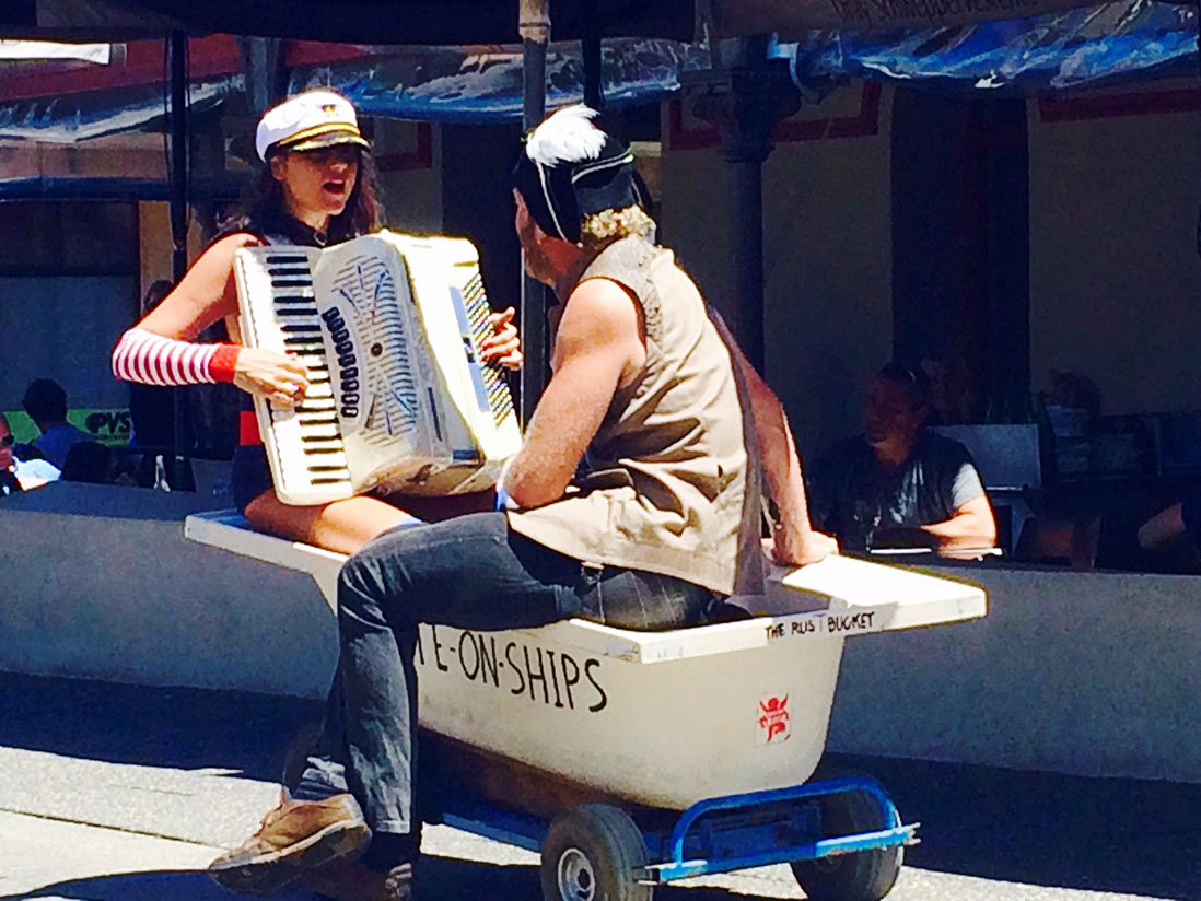 The Sirens are: Rhoda Lopez- vocalist/uke and Beth Sheldon- double bass/vox