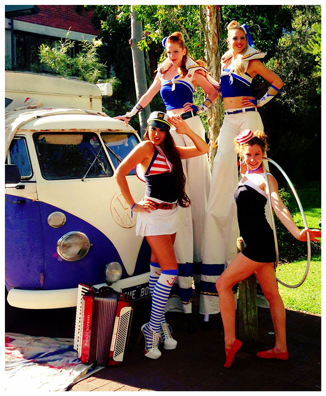 The Sailor Gal Cirque Show are as refreshing as the sea breeze itself! An exciting collection of high class circus performers and musicians, dancing their way through the crowds occasionally pausing to share their sailor gal talents learnt from their world ventures.