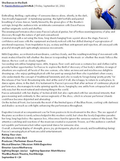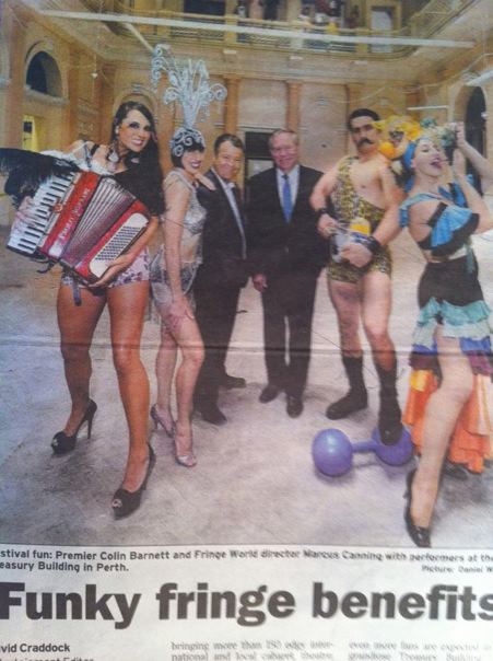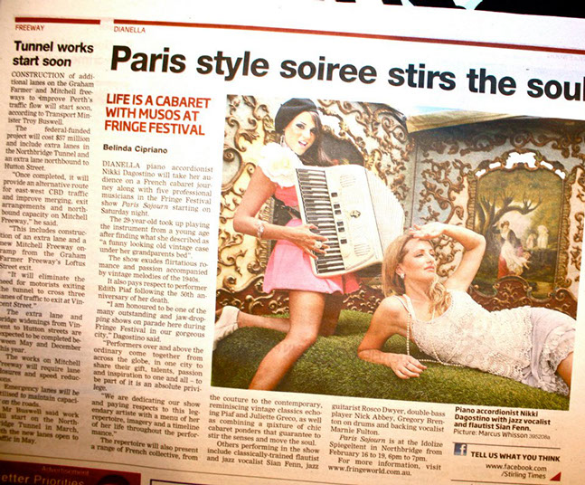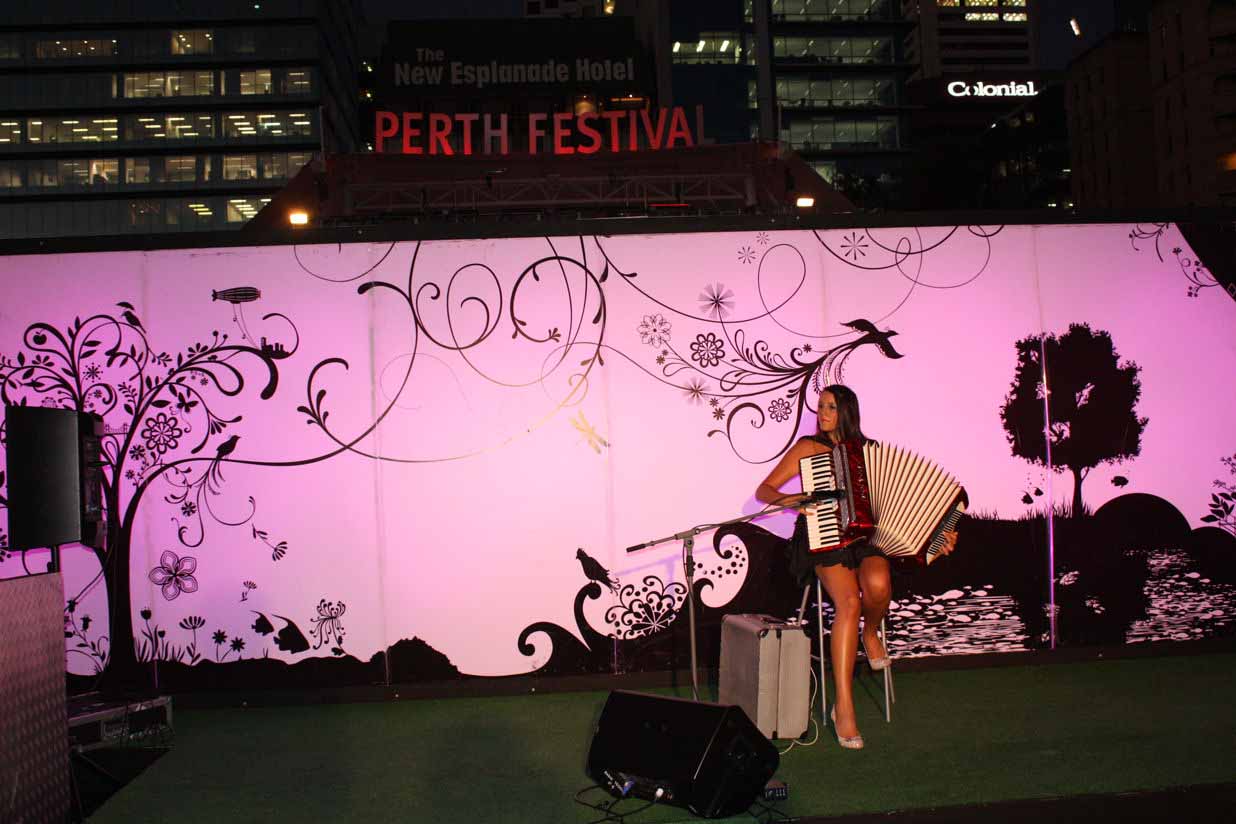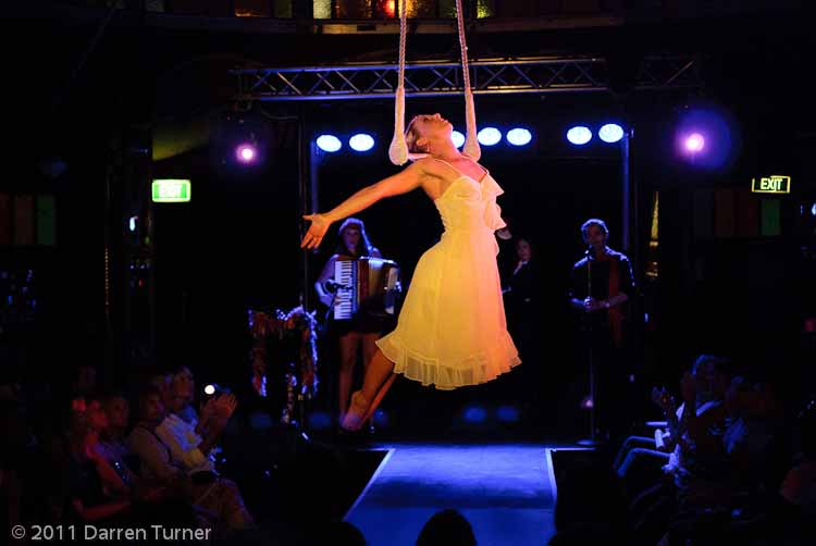 During March (2011), Nikki had the breathtaking experience of performing at The Perth International Arts Festival- Becks Music Box, where she opened and supported America’s sweetheart- Joanna Newsom. During this time and the past 4 years, Nikki was has been heavily involved in the Perth Fringe World Festival- performing inside the De Parel Speigeltent with a variety of shows. Her solo outfit was a hit on the outdoor stage of the inaugural festival for Perth City. The Fringe World Festival has become bigger than ever- with Nikki powering her way through the 25 days of performances amongst over 180,000 people- with a highlight of meeting and conducting a photoshoot with WA premier Mr. Colin Barnett to promote the Arts festival. She was invited to the Awards Ceremony to the pleasing news that her collaboration show ’She Dances in the Dark’ with Dawn Pascoe from Natural Wings was awarded a nomination for Best Circus Theatre Show.