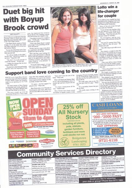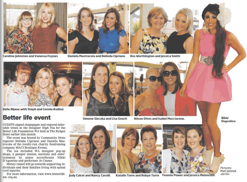 Nikki has also experienced live television exposure appearing annually on Telethon (Channel Seven Perth), local television and monthly airtime on Radio featuring interviews and many live performances in studio for (ABC, RTR FM, 6EBA World Radio and more) as well as a variety of appearances in newspapers: The Australian, West Australian, Sunday Times, Social Pages, magazines and TV Commercials.
