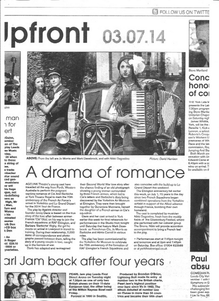 "Cis and Barbiche brings the story of their romance to life, with most of the dialogue taken from their letters and Barbara’s diary, offering an extraordinarily intimate experience of life during the Second World War. Accompanied by the glamorously-dressed Nikki Dagostino on the accordion, fresh from the muddy fields of Glastonubury"...